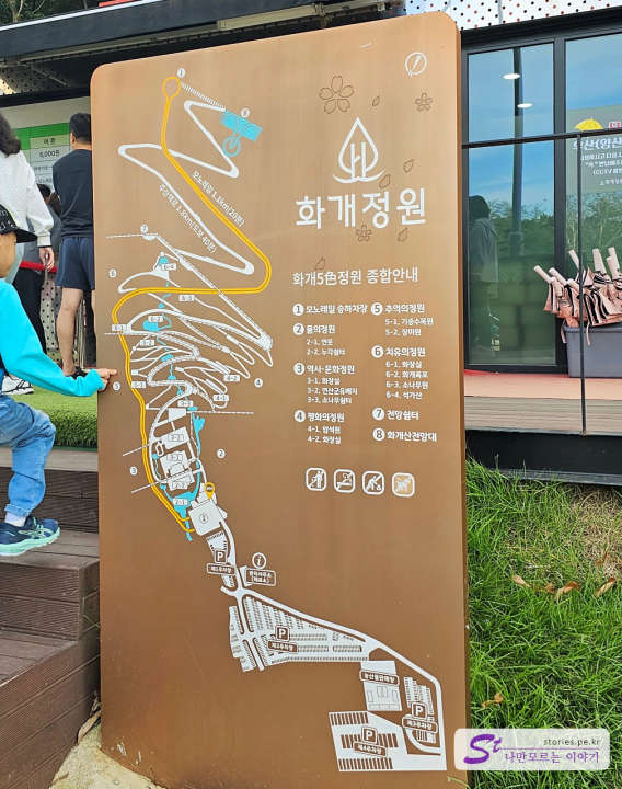 화개산 모노레일을 이용하려면 먼저 화개정원 입장권을 따로 구입해야 해요. 화개정원에는 물의 정원, 문화정원, 평화의 정원, 추억의 정원, 그리고 치유의 정원이 있어요. 화개산 전망대까지 걸어서 올라갈 수 있으며 전망대에서 모노레일을 타고 내려오면서 구경하는 것도 좋을 거예요.