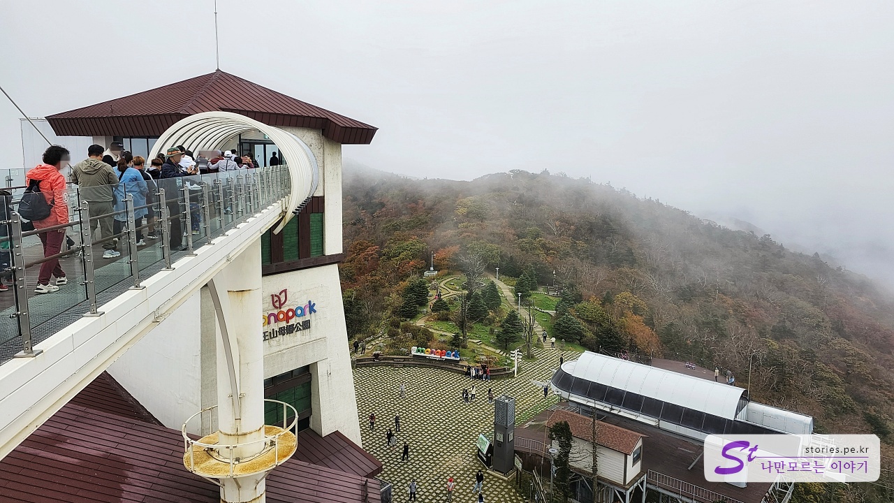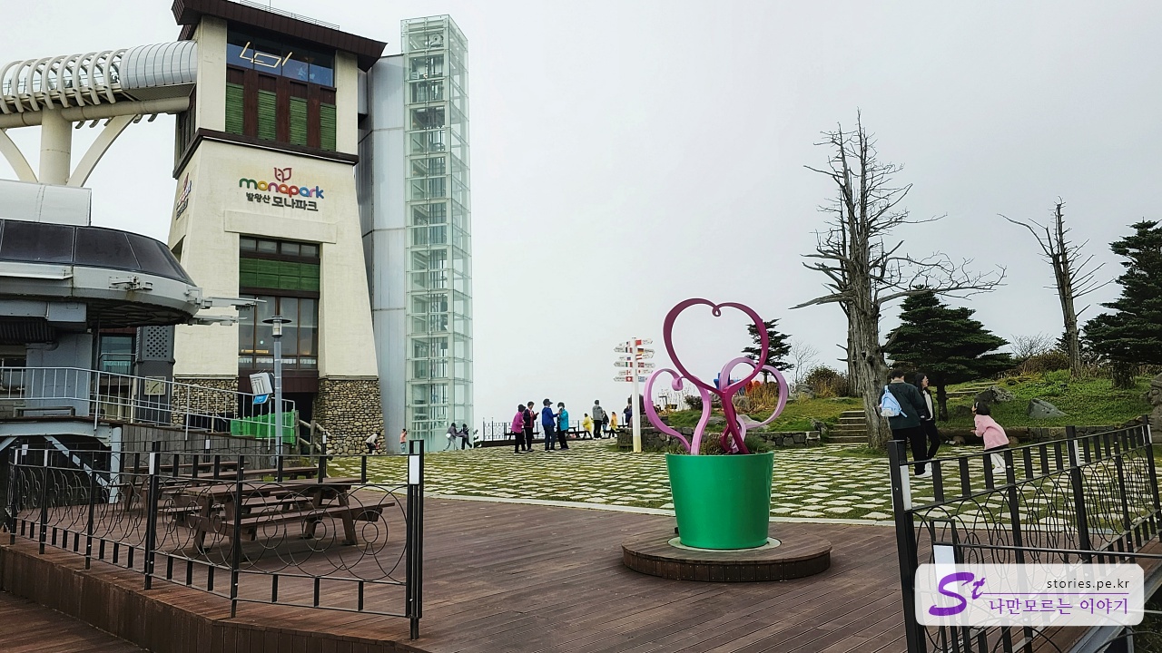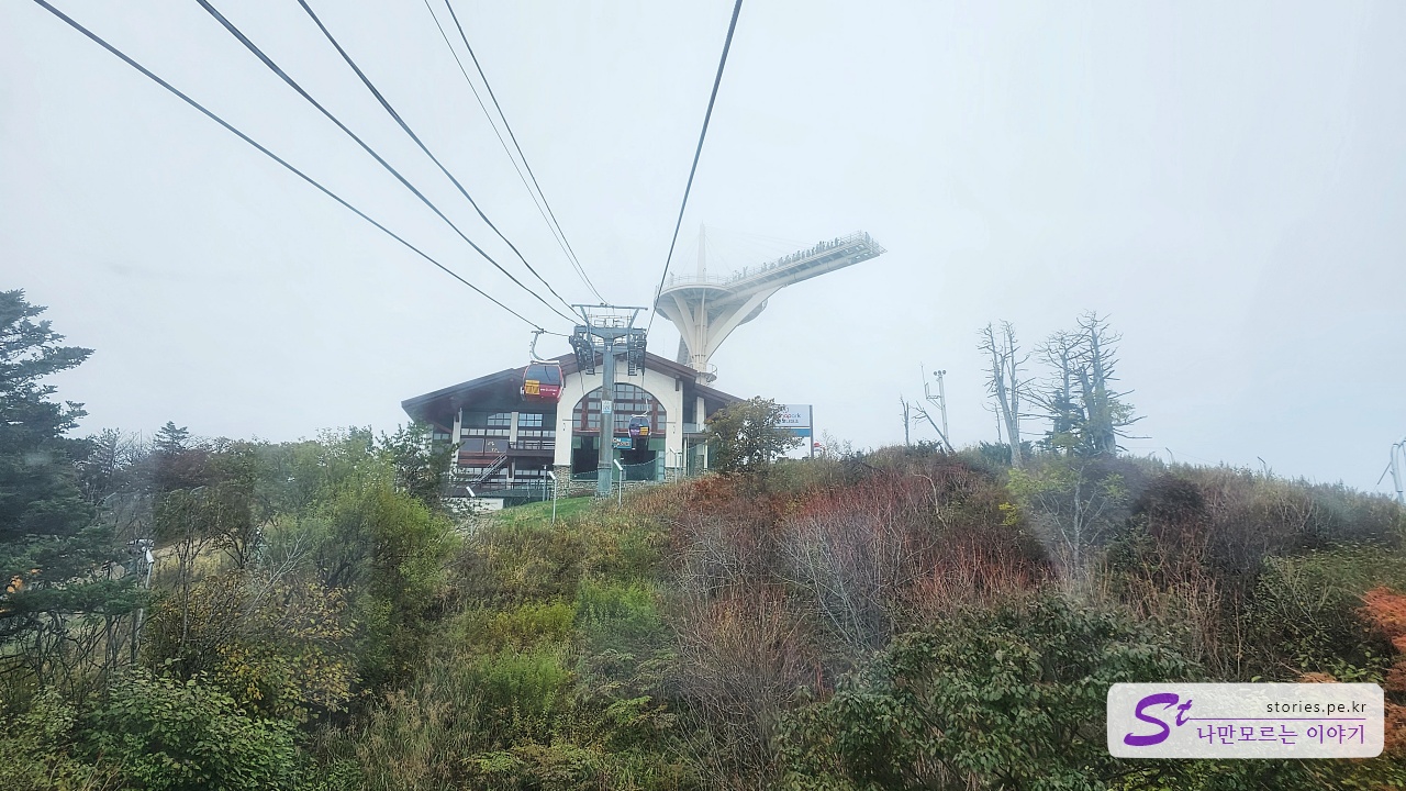 대략 20분 정도 오르면 발왕산 꼭대기에 있는 모나파크에 도착을 합니다. 아래에서는 날씨가 맑았었는데, 아쉽게도 산꼭대기에는 구름이 잔뜩 끼어 있었습니다. 다행히 몇 시간 지나자 다시 날씨가 맑아져서 좋은 풍경은 보고 내려왔네요.