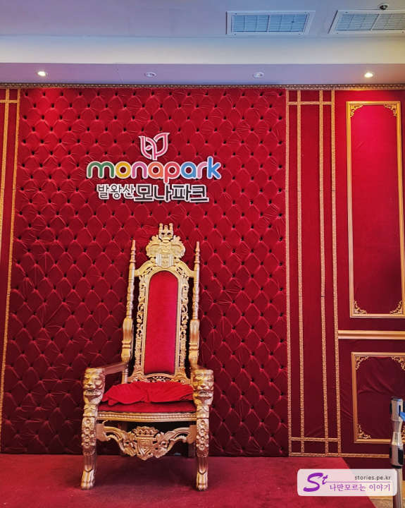 모나파크에 내리면 중국 사람들이 좋아할 만한 아주 눈에 띄는 황금색 빨간 배경의 의자가 하나 있습니다. 사진 찍으라고 놔둔 것 같은데.. 사람들이 줄지어 사진 찍는 거 보면 촌스러워도 인기가 좋기는 합니다.